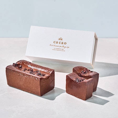 真っ白な箱に、初代ロゴ「ca ca o」を箔で配したシンプルな装い。ブランドのはじまりを象徴する意匠とともに、原点の味わいをお届けします。