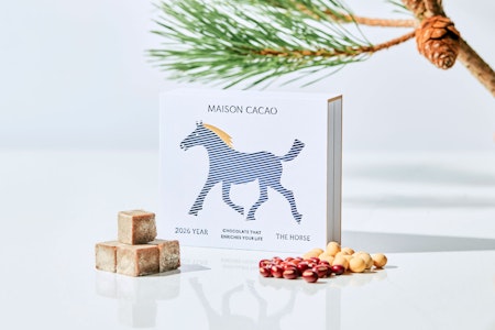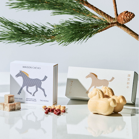 毎年新年を記念した人気のアロマ生チョコレート。2025年の干支、“午”をあしらった限定の一品はあんこときな粉をチョコレートと合わせた和菓子のような味わいです。北海道十勝産の濃い甘みと香りを引き出した発酵小豆をじっくりと炊いたこし餡と、滑らかで繊細な香りを持つコロンビア産のホワイトチョコレートを合わせました。味の決め手にはカカオマスと、引き塩として加える僅かな塩を。仕上げのきな粉が香る、お正月らしい一品です。