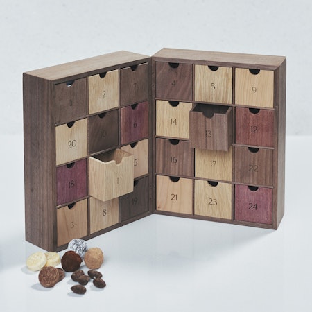 クリスマスまでの日数を数えるように一日一個ずつ開ける引出しの中には、MAISON CACAOの新作を含むとろける口どけの「生トリュフ」や「生チョコクッキー」「ダマンド・ショコラ」等が収まっています。クリスマスを心待ちにするワクワク感と、プレゼントを開ける高揚感をお楽しみいただける、MAISON CACAOからの新提案です。