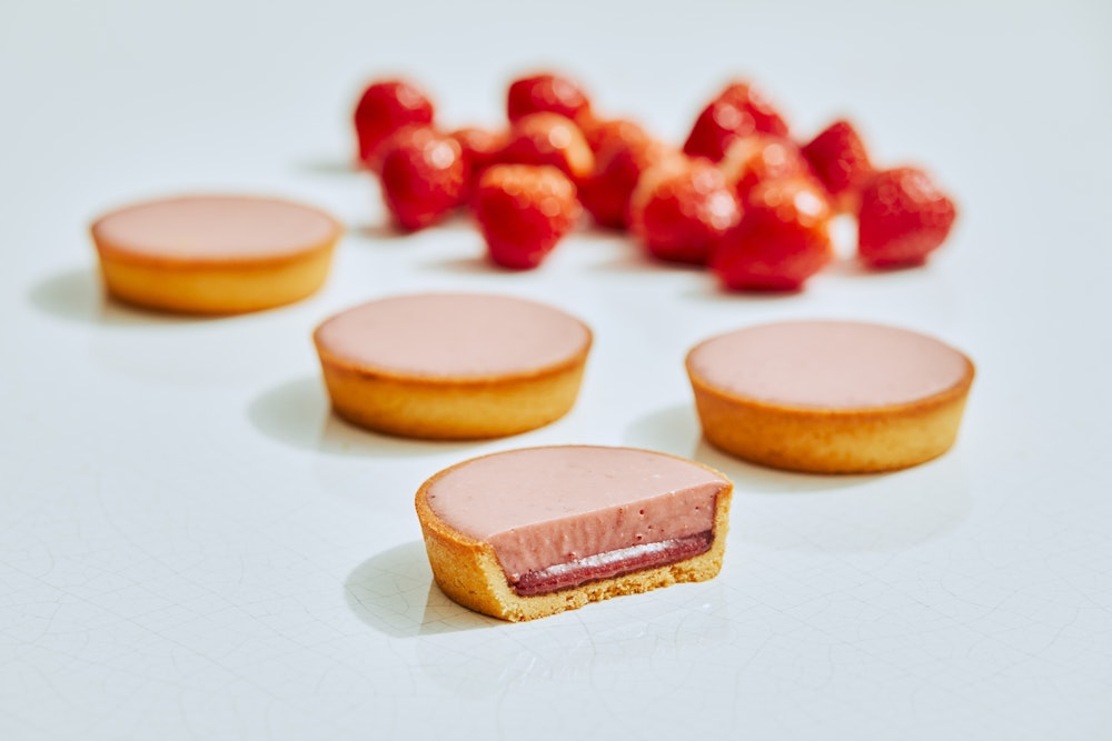 シンプルな美しさにこだわりながらも、味わいと食感を4層で作り込んだ一品です。手焼きのタルト生地にあまおうの濃厚なソースを流し、ホワイトチョコレートと合わせたなめらかなあまおうクリームを重ね、食感の良いチョコレートでコーティングをしました。