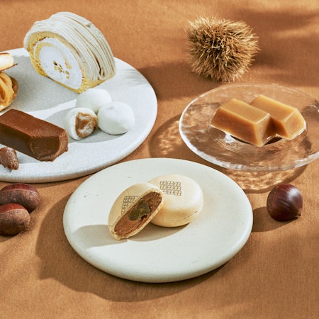 食感の良い皮の中に、コロンビア産の2種のチョコレートをブレンドしたエアリーなクリームと小布施堂の和栗を挟みました。栗本来の旨みを引き出すため、甘みと食感にこだわり作り上げた栗の甘露煮を、なめらかな栗あんで包み中に忍ばせています。