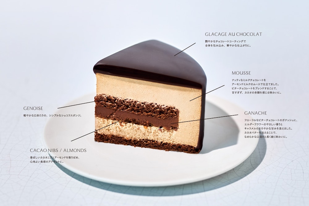 コロンビア産の新鮮なカカオだけを使い、華やかで奥行きのある味わいと、驚くほどなめらかな口溶けを追求しました。ふんわりと軽やかなショコラ生地の上に、やさしい甘みのミルクチョコレートとアーモンドミルクを合わせたムースを重ねました。ムースはカカオマスのアクセントが程よいビター感を添えます。中にはカカオニブとローストアーモンドで食感の楽しさを。フローラルなビターチョコレートガナッシュには、エルダーフラワーのやわらかな香りとキャラメルの余韻を重ね、カカオバターを加えることでしっとりと長く続く口溶けに仕上げました。隠れるように忍ばせたチョコレートスポンジが、全体をしっとりとまとめあげます。5層の調和が織りなすのは、まるで一口ごとに新しい発見が訪れるような、心躍るクリスマスのひととき。