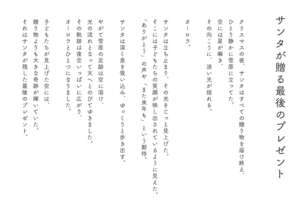 今年のテーマは、“奇跡を包む光”。サンタが贈り物を届け終えた夜、空に残した光の道、それがオーロラ。