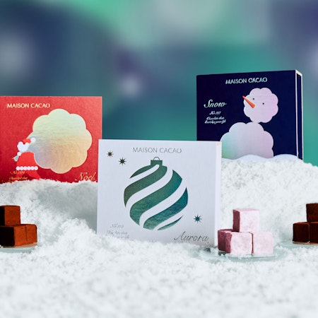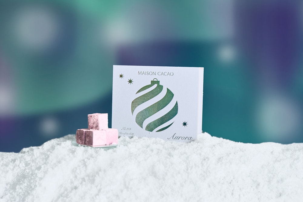 そんなオーロラシーズンを飾る今回のコレクション。オーロラが空を包むように、チョコレートで世界を優しく包みたい、それがこの季節に込めたメゾンカカオの想いです。
