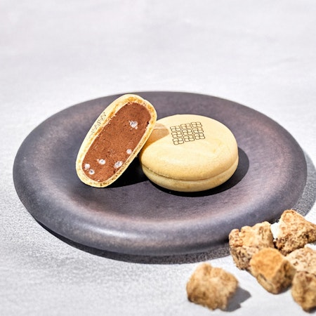 サクサクのモナカ皮に、コロンビア産カカオを使用したふんわりチョコレートクリームを贅沢に絞った「団らんモナカ」。鎌倉の紫陽花をモチーフにした家紋が象徴するのは「和やかさ」と「絆」。モナカの二枚の皮が重なる様子は、縁を結び合う二枚貝のように、人と人をつなぐ想いを込めています。新作は沖縄県波照間島の黒糖を合わせた奥深く優しい味わいです。