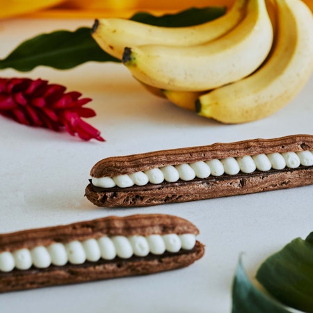 サクサクのシュー生地の中に、バナナピューレの濃厚なミルクチョコレートガナッシュ、アクセントのキャラメリゼしたアーモンド、パリパリの板チョコ、バナナピューレの軽やかな生クリームをたっぷりとサンドしました。本店限定のリッチな生チョコエクレアです。
