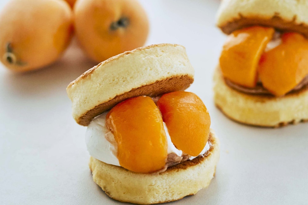 生どら焼きから旬の味わいが登場。長崎県のみずみずしい枇杷「なつたより」をそのまま、カカオビネガーの生クリームに杏仁を効かせ、しっとりふわふわの生地で挟みました。