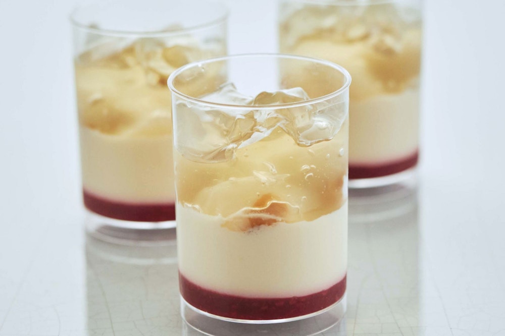 初夏らしい爽やかな4層仕立てのパルフェが新登場。下からあまおうとフランボワーズのあまずっぱいソース、優しい味わいのはちみつのムース、みずみずしいライチの果肉と、上にはフルーティーなカカオビネガーのゼリーを重ねました。