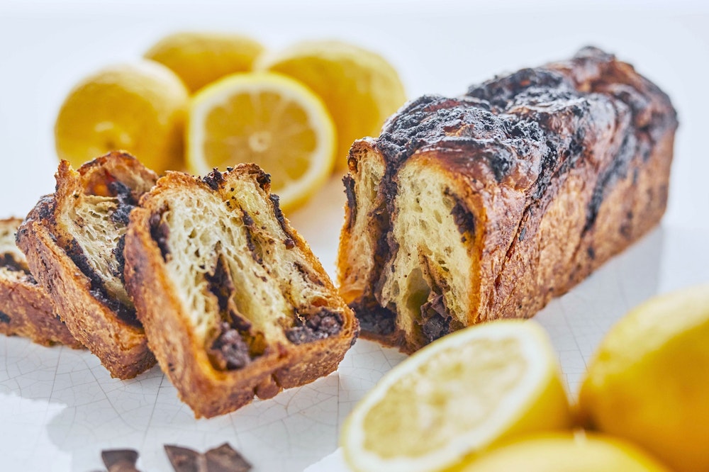 国産の発酵バターを使用したクロワッサン生地に、和三盆のチョコレートをたっぷり練りこんだサクサク食感のチョコレート食パン「バブカ」からレモンが新登場。日南レモンの皮を合わせた、爽やかなレモンチョコクリームを入れました。