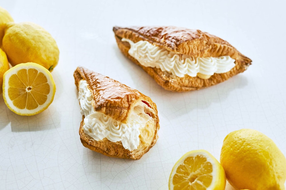 たっぷりのバターを練り込み、144層にも重ねた軽やかでサクサクの三角パイの中に、宮崎県日南市のレモンの果汁と皮まで使った、レモンカスタードとレモン生クリームをたっぷりつめました。