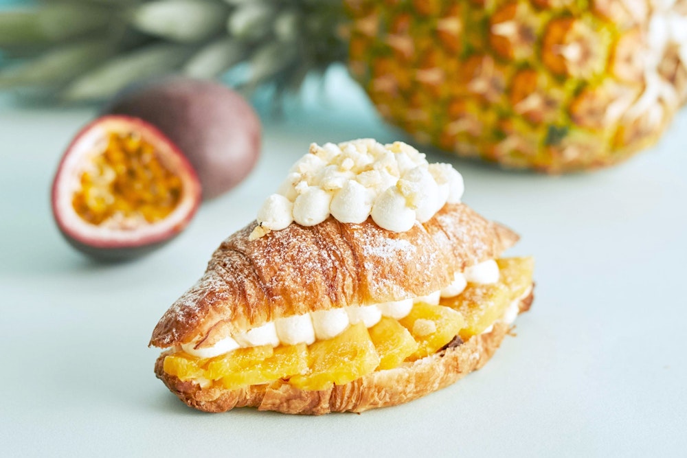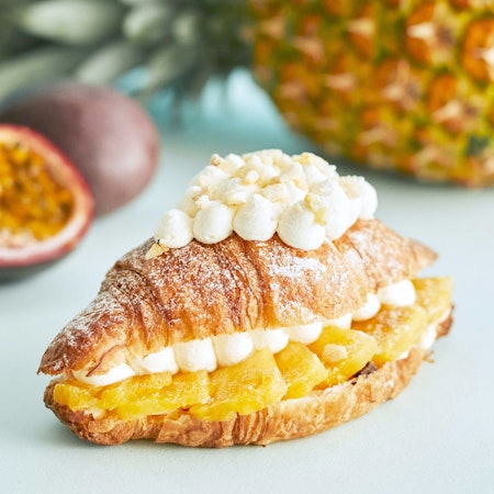 発酵バターを使用した軽い食感のクロワッサンの中に、カスタードクリームとパッションフルーツの自家製生クリーム、ゴールドバレルの果肉をサンドしたデザートクロワッサン。