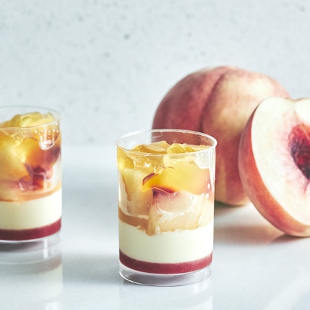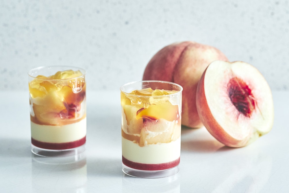 4層仕立てのカップデザートです。下から甘酸っぱいベリーのソース、優しい甘さのはちみつのムース、カカオの果汁部分から作ったカカオビネガーのさっぱりとしたゼリーに、濃い甘みの”桃”を贅沢にトッピングしました。