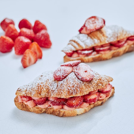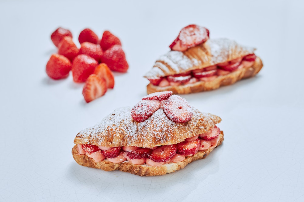 国産の発酵バターを使用し、あえて8層仕立てと層を通常より少なくすることで食感にこだわったクロワッサンの中に、あまおうの滑らかなカスタードクリームと大粒の果肉をサンドしたデザートクロワッサンです。