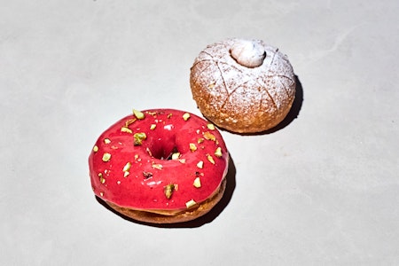 ラズベリーの甘酸っぱさとピスタチオの香りが重なるグレーズ ドーナツと、なめらかなメープルチョコレートクリームのドーナツ。