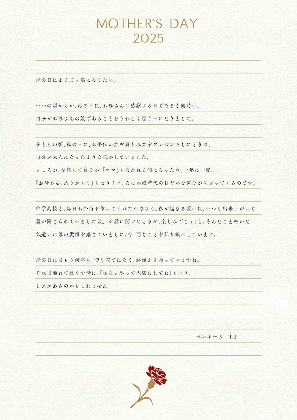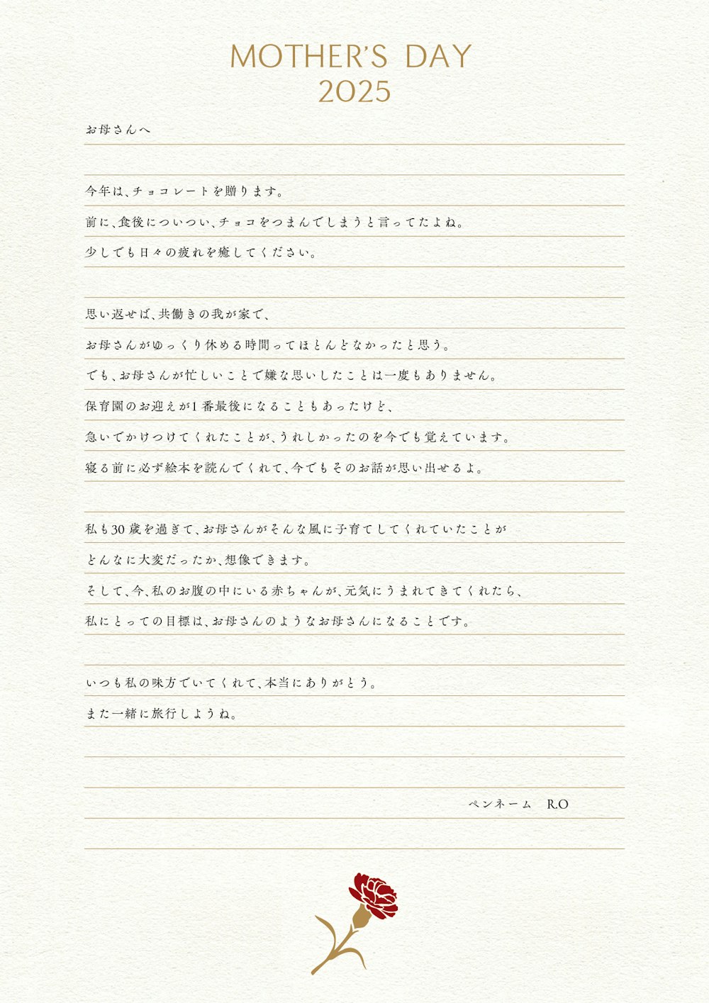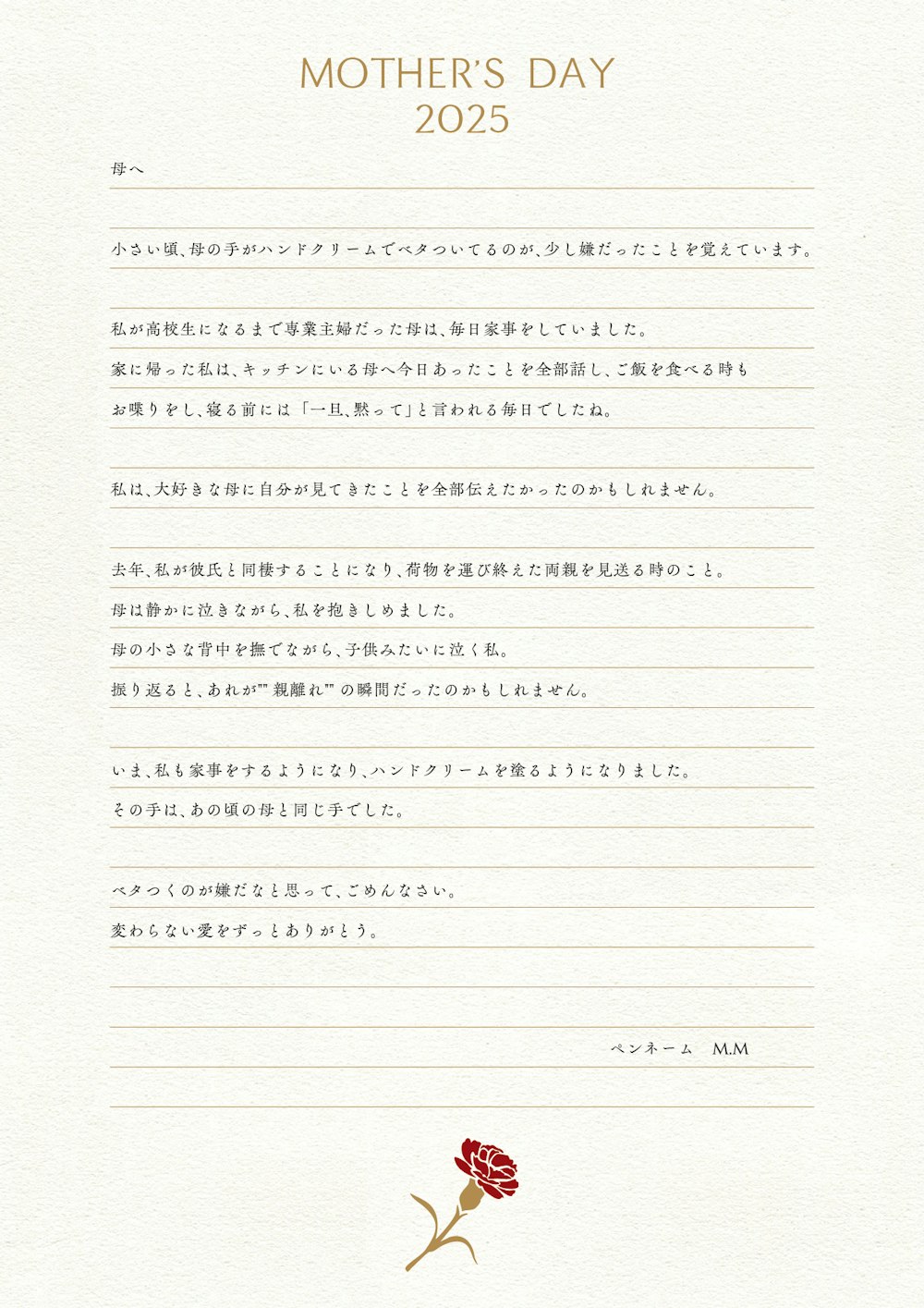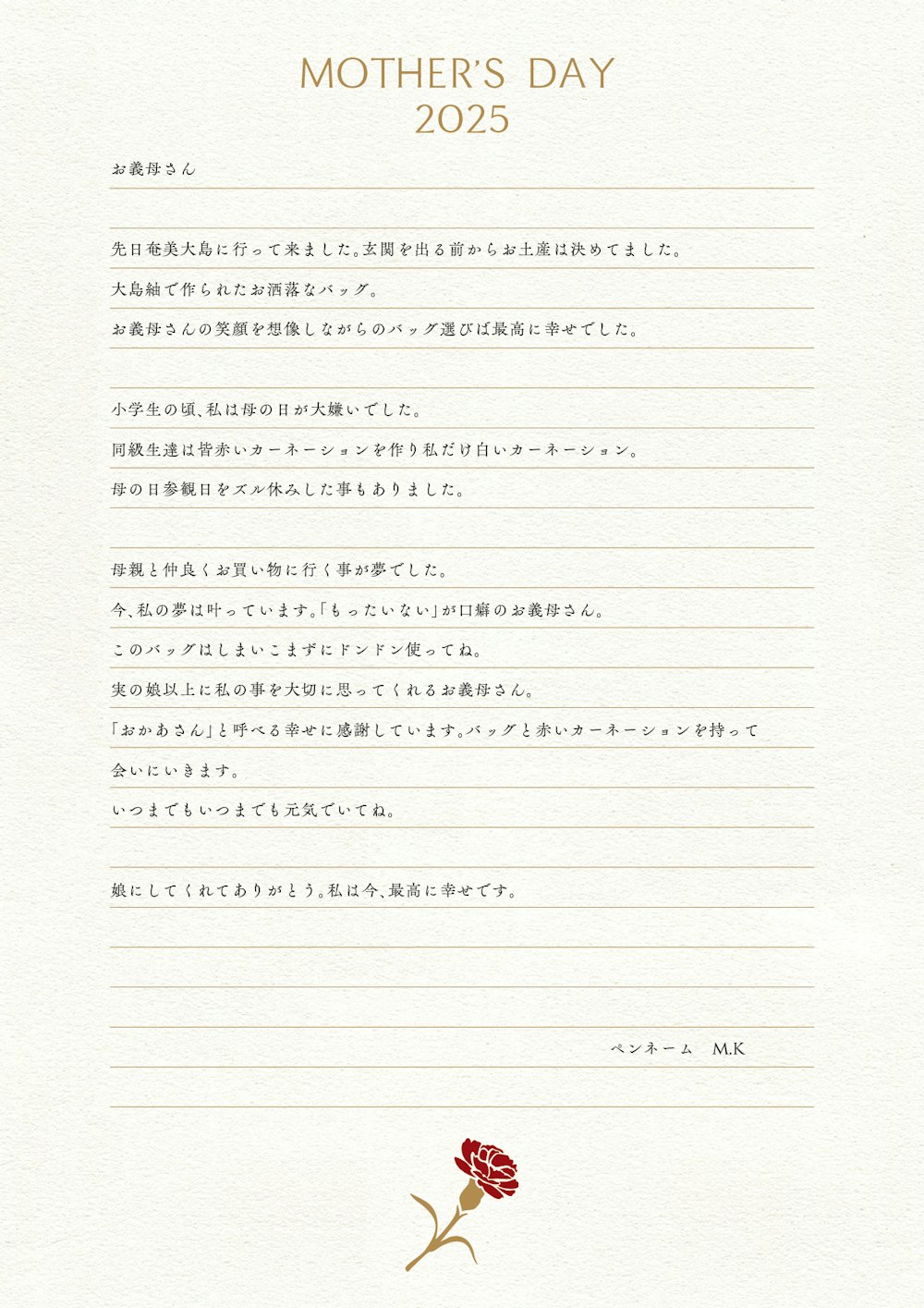 愛情にあふれたお母さまへのお手紙、ありがとうございました。