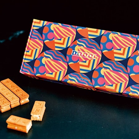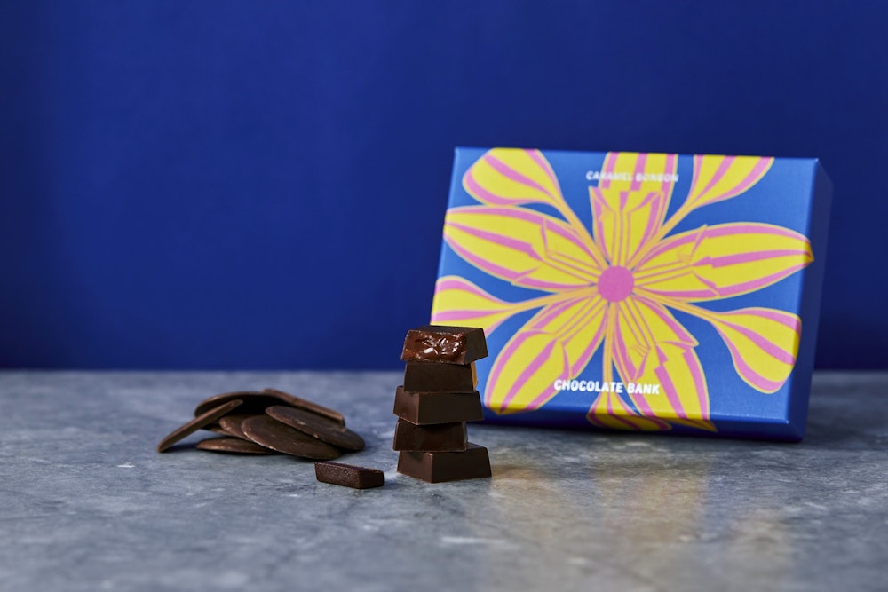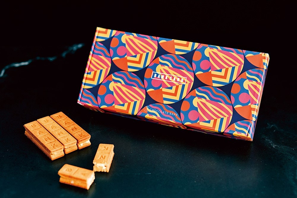 チョコレートバンクの新たなシグネチャー、BANK BON BON。 カカオの秘密。じつはカカオは油脂を豊富に含んでいる ため、チョコレートを製造する⼯程で植物性のバターが つくられます。良質なカカオバターで⾵味豊かなキャラメルをつくり、薄く繊細なチョコレートで閉じ込めたの がチョコレートバンクの「バンク・ボンボン」です。 同じカカオからつくられた素材だけに、その相性は抜 群。体温で溶けるカカオバターキャラメルは⼝に含んだ 瞬間に溶けてチョコレートとひとつになります。ビター、あまおう、アールグレイ&アッサム、ヘーゼル&オレンジ、アップル&メープル、フィグ&ワインのフレーバをご用意します。