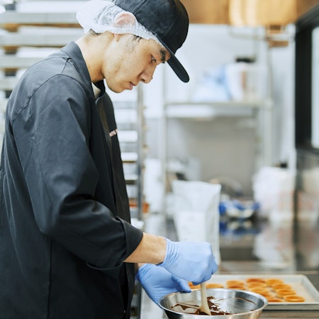 メゾンカカオに入社する前、他店で働いた経験が9年ほどあるのですが、メゾンカカオ特有の社風として、チャレンジのしやすさがあると思います。個人経営の小さなお店ならともかく、この規模の会社でそうした気風が徹底されていることに最初は驚きましたが、今はこの環境が自分にすごくフィットしていると感じています。そしてまた、メンバーみんなが情熱的でチームワークを大切にするところもメゾンカカオらしい雰囲気といえます。僕はパティシエとして入社し、その後ショコラティエになり、今は自分のチームも持たせていただけるようになりました。自分自身の成長を感じるとともに、今ではチームリーダーとしての意識も芽生えてきたように思います。部下の成長を自分ごとのように感じられ、そこにすごくよろこびを感じる。メゾンカカオに入ってから、お客様の期待を超えるようなおいしい製品をつくって、多くの人を幸せにしていきたいと考えるようになったし、今はブランドのシグニチャーとなる製品を生み出すことで100年後も愛されるものづくりをしていきたいと強く思っています。