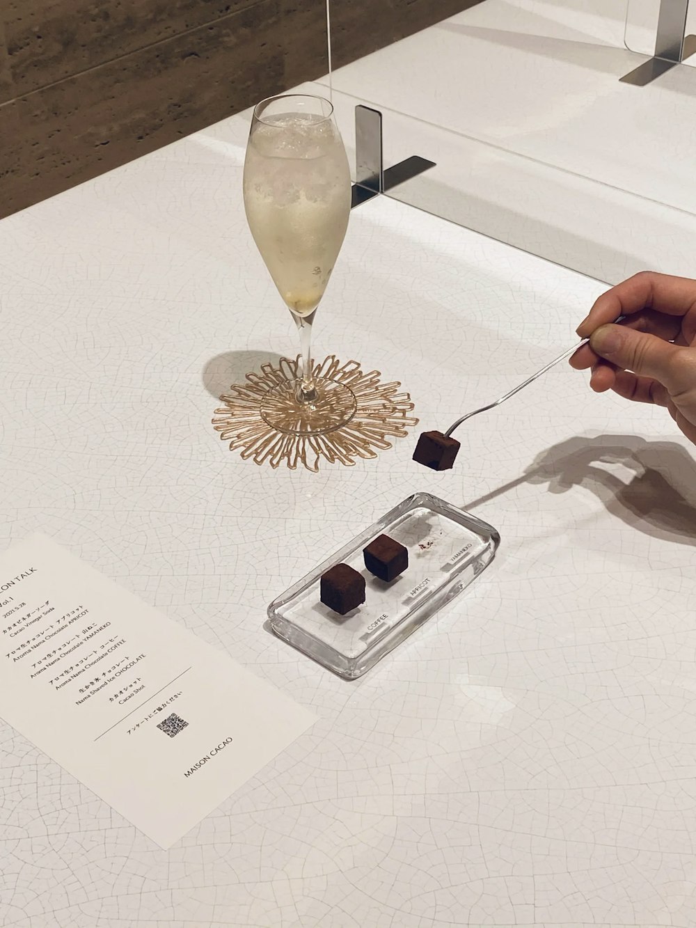 そんなMAISON SALONで、ゆっくりお互いに会話を楽しみながら、最新のブランドに触れられるイベントとして【MAISON SALON TALK】がスタートいたしました。第一回はブランド創設者であり、カカオディレクターでもある石原紳伍よりブランド誕生秘話やここだけの開発ストーリー、新たなチャレンジの共有をしながら、新作、未発売のアロマ生チョコレートや夏スイーツのかき氷をオススメの食べ方でお楽しみいただきました。