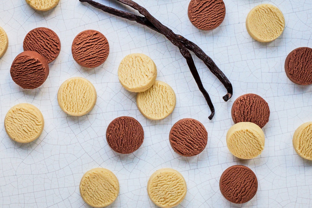 ミルクチョコレート:バニラと合わせるのは人気の味わいのミルクチョコレート。繊細なブレンディングから生まれるまろやかな味わいで、カカオ感と共にキャラメルやナッツの香ばしさが薫る優しい甘みです。