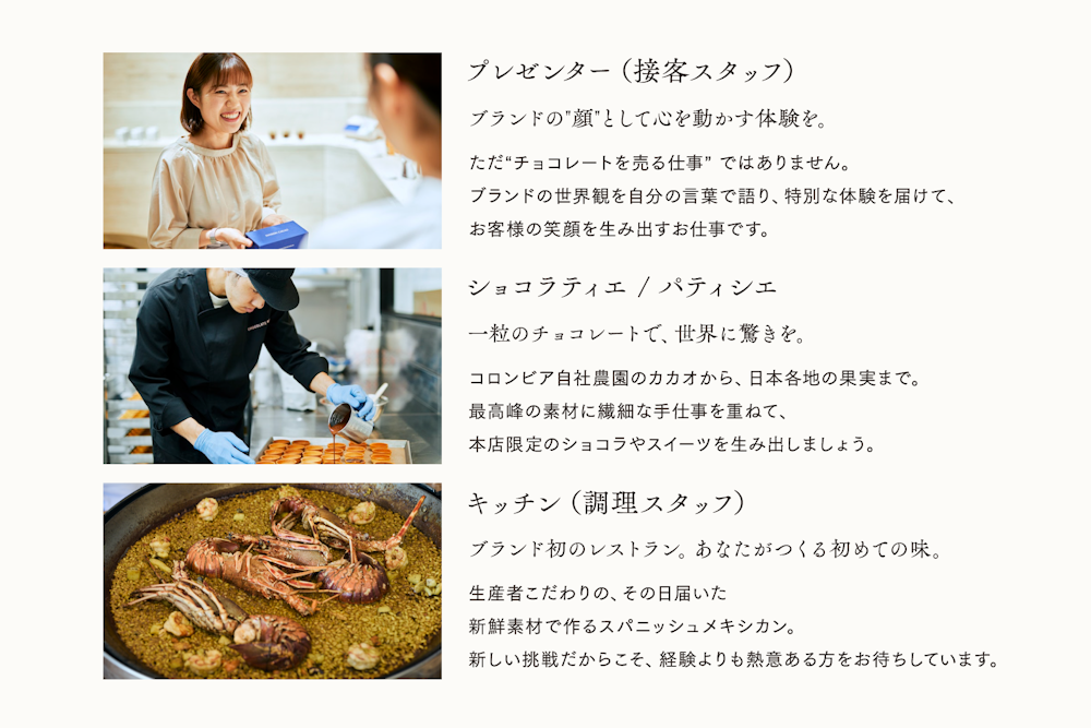 入口にはワゴンが並び、季節ごとに ジェラートやホットチョコレートをお届け。 タルトやエクレアなどの人気スイーツに加え、 30種以上の生菓子やデセールを展開。 スペシャリティコーヒーや旬の果実ジュースで チョコレートとのマリアージュを楽しめる空間に。