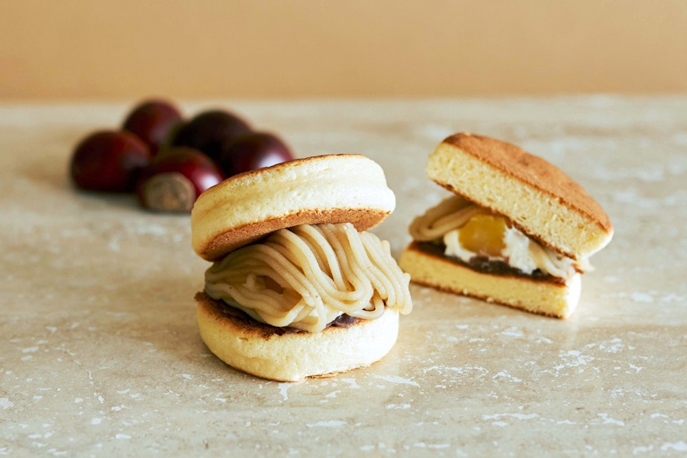 深い甘みと複雑な旨みを持つ本みりんを使用し、銅板でじっくりと焼き上げたどら焼きの中は4層仕立てにしています。コロンビア産の華やかな香りを持つビターチョコレートと北海道産の粒あんを合わせた自家製のチョコあんに、カカオのフルーツビネガーを加えたさわやかな生クリームを絞りました。そこに小布施堂こだわりの栗の甘露煮を乗せ、上にはなめらかな栗あんを絞ったモンブラン仕立ての生どら焼きです。