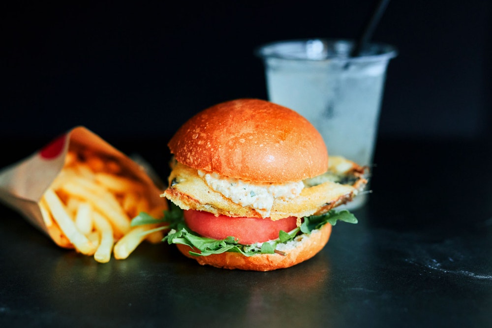 フィッシュバーガーは、サスエ前田魚店から仕入れた鮮魚のベニエが主役。外はさっくり、中はほろほろの魚のベニエとカカオビネガーのタルタルソースをサンドしました。