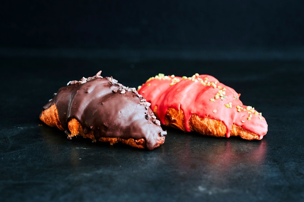 真っ赤なクロワッサンの中には、ジューシーなあまおうとバニラを合わせた至福のカスタードクリームをたっぷりと絞り入れました。チョコレートに覆われたクロワッサンの中には、刻みチョコとアーモンドミルクを合わせた滑らかなチョコクリームを詰め、アクセントにカカオニブを塗した、チョコづくしの一品です。