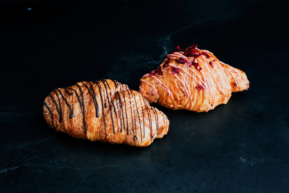 8層仕立ての食感の良いクロワッサンの中に、それぞれあまずっぱいフランボワーズを効かせたカスタードチョコクリームと、華やかな味わいのビターチョコレートクリームをたっぷりと絞りました。