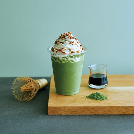 すっきりとしたホワイトチョコレートに福岡 奥八女の一番茶を石臼挽きした抹茶を贅沢に使用したフローズンドリンク。黒みつもアクセントになる、デザートのような生チョコパフェドリンクです。