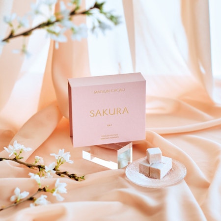 コロンビア産のピュアカカオバターのみで作り上げた、華やかな味わいとすっきりとした後味のホワイトチョコレートに桜を合わせました。塩漬けにした桜と、花弁から抽出したフローラルウォーターをブレンドし、とろけ出す舌触りと共に、桜の香りが口いっぱいに柔らかく広がる上品な味わいです。