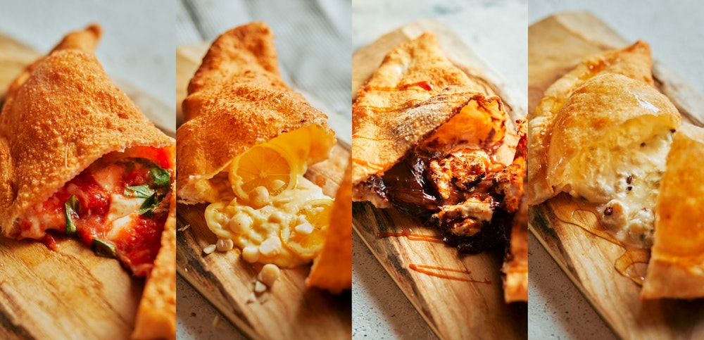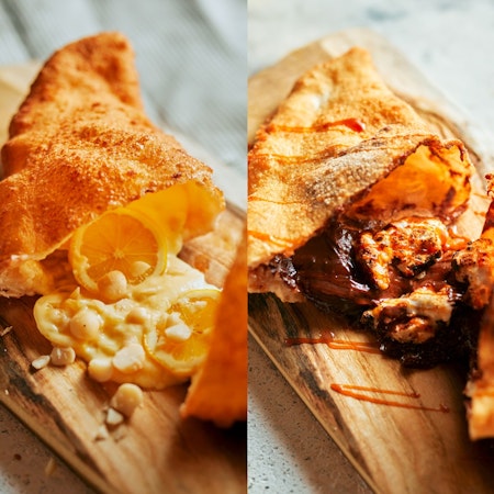生地から手がけるこだわりのピザがブランドから初登場。外はカリっ、中はもっちりの生地の中に、4種のフレーバーを潜ませています。チョコレートピザはビターとホワイトの2種。コロンビア産チョコレートの味わいと口溶けを楽しめる一品です。しょっぱい味わいがお好みなら、カカオマルゲリータとクワトロフォルマッジ&ニブハチミツをご用意。出来立て熱々を会場でお楽しみください。