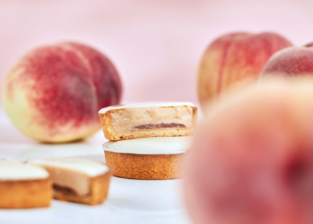 シンプルな美しさにこだわりながらも、味わいと食感を4層で作り込んだ一品です。手焼きのタルト生地に濃厚な白桃のピューレを敷き、ホワイトチョコレートとヨーグルトと合わせた滑らかな白桃クリームを流し入れました。