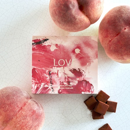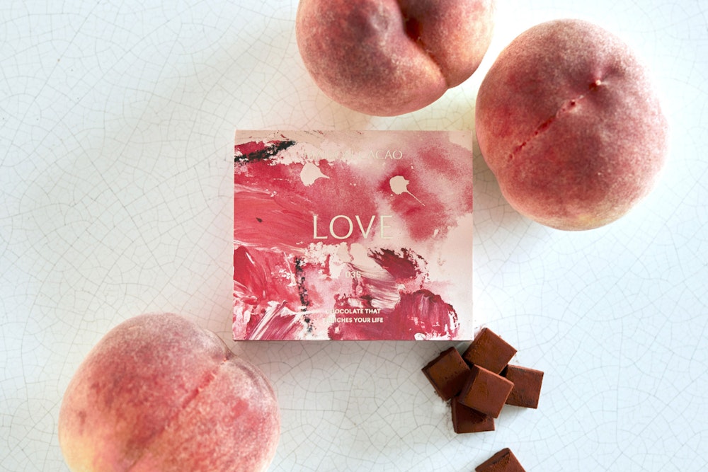 代表の石原が日本各地を旅して出会った生産者の素材へのこだわりを聞き、その美味しさを最大限に引き出すチョコレートを作り、旬の味わいとして提案しています。7-8月は山梨県山梨市、桃の名産地の中でもひときわ手間暇をかけて育てられた笠井農園の白桃が登場。