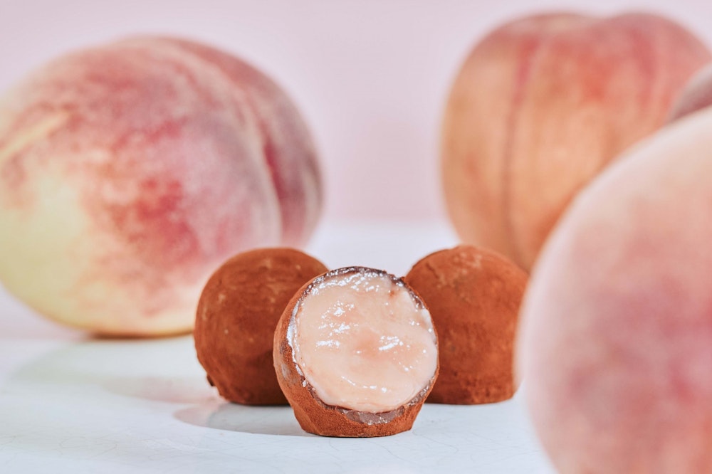 メゾンカカオの看板品「アロマ生トリュフ」は、パリッと薄いコーティングの中からなめらかなガナッシュが流れ出る、究極の口溶けにこだわった一品です。夏限定フレーバーとして、笠井農園の白桃を使用した味わいが登場します。酸味は少なく糖度の高い爽やかな味わいを持つ白桃のピューレとホワイトチョコレートを合わせた瑞々しいショコラがとろけ出します。