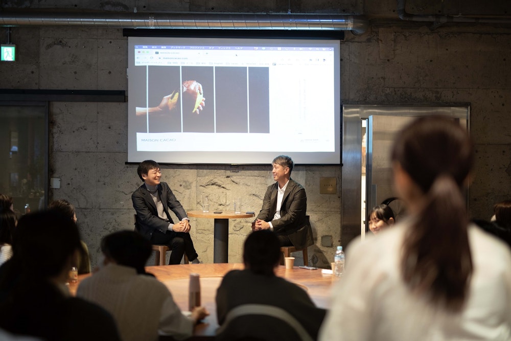 2022年最後のメゾントークのゲストはコピーライター、クリエイティブディレクターとしてさまざまな企業のブランディングやコミュニケーションに携わる蛭田瑞穂さん。蛭田さんとメゾンカカオの出会いは2020年にさかのぼります。以来、ブランド理念の策定から鎌倉駅の常設広告に至るまで、さまざまな言葉を紡いでいただきましたが、この度その集大成ともいえるブランドサイトが完成。それを記念して、創業者石原紳伍との対談が催されました。蛭田さんが言葉に込める思いやブランドについての考え方など、さまざまなお話を伺いました。