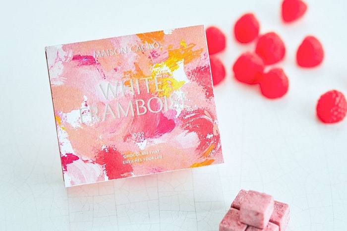 花のような華やかな香りと優しい甘さのホワイトチョコレートに、あまずっぱいフランボワーズを合わせました。「旅するメゾン」で出会った、北海道帯広の山間で育てられる国産フランボワーズは、味がギュッと詰まって濃厚なあまずっぱさと香りを持ちます。華やかに広がる味わいを紅茶やお酒とともに、お楽しみください。