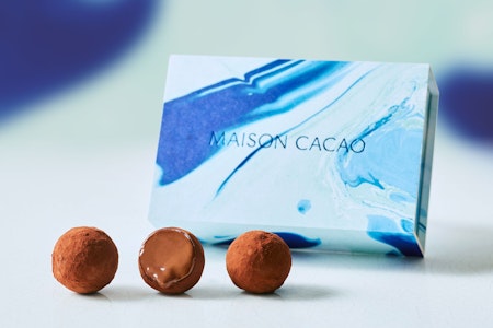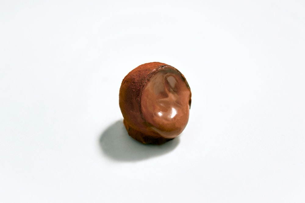 外側のチョコレートは少し力を入れただけで割れそうなほど繊細ながら、口の中でパリッと弾けた瞬間に、中から液状のチョコレートが溢れ出します。それは出会ったことのない、驚きに満ちた体験。生チョコレートならではの食感、水分量、香りと味わいが表現された一粒をそっと指でつまんで、お召し上がりください。